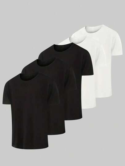 5pcs/Set Tween Boys Black Crew Neck Short Sleeve T-Shirts, Soft & Comfortable Tees Suitable For Casual Daytime And Warm Nights! Kids Graphic Tees - Black and White - View 1
