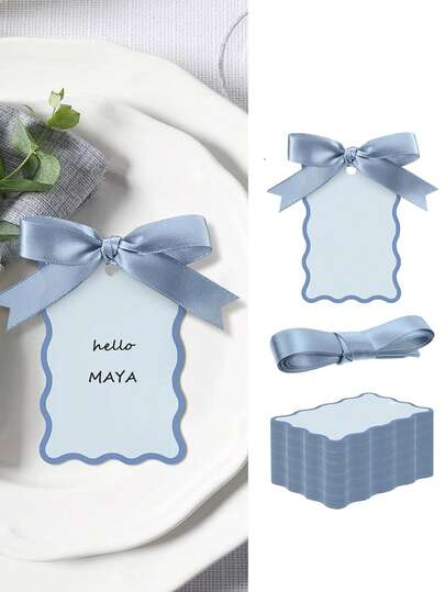 6/24/48pcs Scallop Shape Name Place Cards With Ribbon, DIY Wedding Table Number Cards With Satin Ribbon (Blue) - Baby Blue - View 1