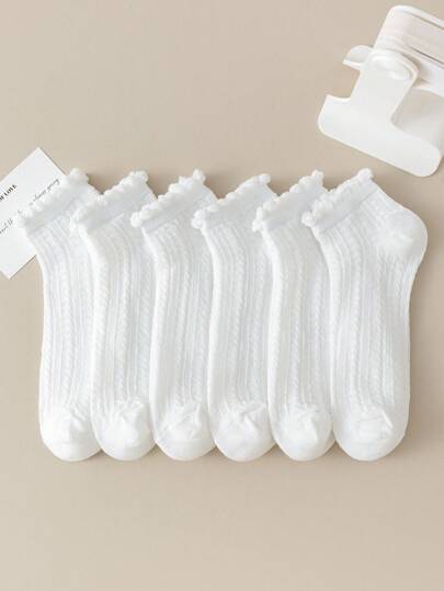 6 Pairs Women Short White Socks, Casual Cute All Season Versatile Socks With Cable Knit Design, Suit For Spring/Summer - White - View 1