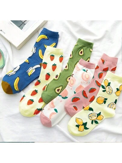 6 Pairs/Set Women's Colorful Fruit Pattern Avocado Banana Pear Watermelon Pink Peach Moisture-Wicking Comfortable Sweet Lady Streetwear Mid-Calf Socks For Spring, Autumn, Winter - Multicolor - View 1