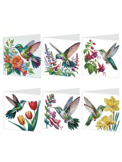 6 Pcs 5D DIY Diamond Painting Greeting Card Kits - Hummingbird & Flower Design, Handcrafted Glitter Birthday Cards With Envelopes, Perfect For Gifts & Congratulations - Hummingbird - View 1