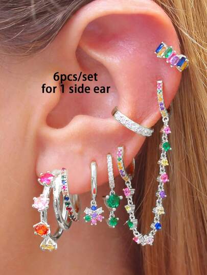 6 Pcs Luxury 24K Gold Plated Cubic Zirconia Dangle Earrings For Women Colorful Zirconia Hoop Earrings Set Fashion Jewelry - Silver - View 1