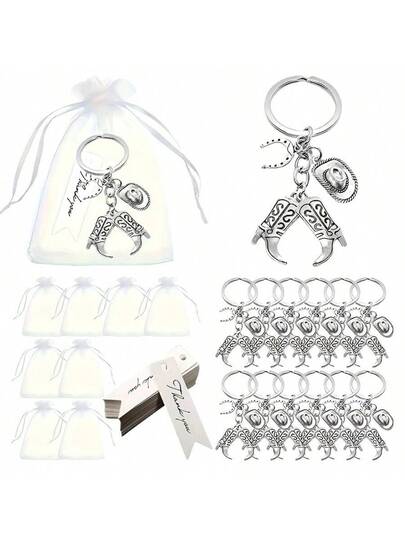60-Pack Cowboy Western Keychain Party Favor Set - Stainless Steel Key Rings With Hat, Boot & Horseshoe Charms, Includes 20 Thank You Cards & 20 Organza Gift Bags - Equestrian Keychains For Gifts, Cowboy Themed Party & Wedding Thank You Presents - White - View 4