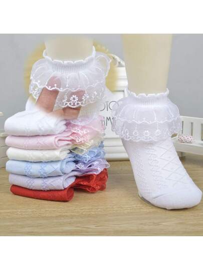 6pairs/pack Girls' Lace Trim Mesh Short Socks In 6 Colors For Daily Wear - Multicolor - View 1