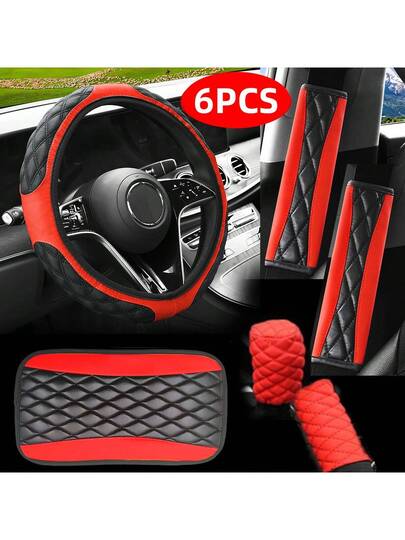 6pcs Car Steering Wheel Cover Set, Bicolor Rhombus Bubble Design, Fits 14.5-15 Inch Steering Wheel, Handbrake Cover, Gear Shift Cover, Shoulder Pad, Seat Belt Decor, Car Interior Accessories - one-size - View 1