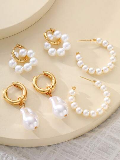 6pcs Elegant & Sophisticated Faux Pearl Stud Earrings Set, Everyday, Date, Commute, Birthday, Valentine's Day Gift For Her - Yellow Gold - View 4