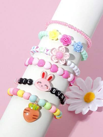 6pcs Kids Beaded Flower & Rabbit Charm Bracelet Set, Assorted Colors, Suitable For Holiday Gifts - Multicolor - View 6