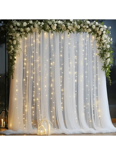 6pcs Luminous White Tulle Background Curtain, White Wedding Arch Gauze Curtain With String Lights, 500*160 Cm Wedding Background Decoration Transparent Gauze, Wedding Arch Ceiling Decoration, Suitable For Weddings, Birthday Parties, Home Decoration, Photo Props, Back To School Valentine Day - White - View 1