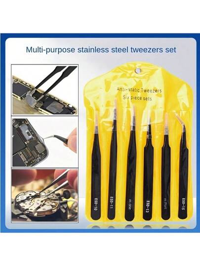 6pcs Metal Tweezers Set, Precision ESD Pointed & Angled Tweezers Bag, 1mm Straight, Angled, Eyebrow Tweezers, Repair Tool - Black - View 1