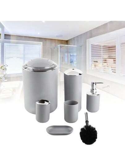 6pcs/Set Bathroom Accessories Set Toothbrush Holder,Trash Can,Soap Dispenser (Gray) Back To School - Dark Grey - View 1
