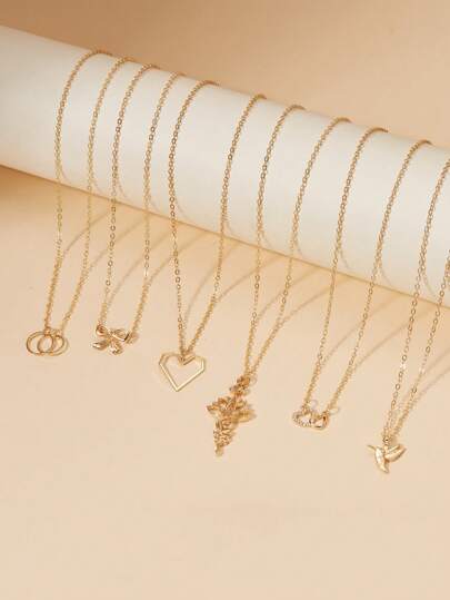 6pcs/Set Bowknot Heart Bird Circle Combination Alloy Necklace Valentines - Yellow Gold - View 1