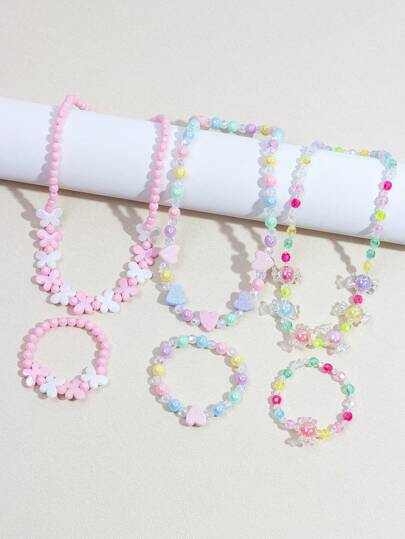 6pcs/Set Girls Cute Butterfly & Heart Beaded Necklace & Bracelet Jewelry Set, Assorted Color Gift For Party, Birthday, Festival - Multicolor - View 1