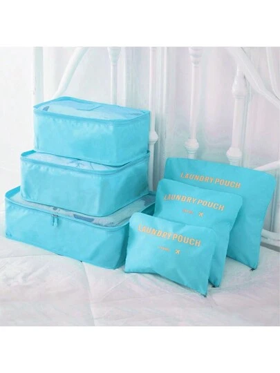 6pcs/Set Waterproof Luggage Travel Storage Organizer Packing Cubes, Colorful & Letter Print Pattern, Portable Oxford Cloth Design, Suitable For Travel, College Dorm Back To School Supplies - Blue - View 1