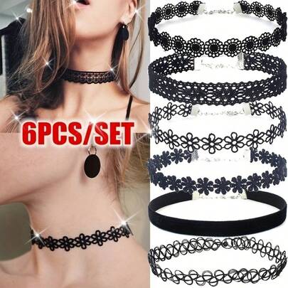 6pcs Velvet Choker Necklace Set, Gothic Sexy Lace Tattoo Style, Adjustable Suitable For Daily And Party Wear, All Season Synthetic Fiber Choker - Black - View 1
