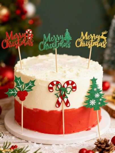 6pcsMerry Christmas Cake Decorative Tag, Christmas Holly Leaves And Berries, Santa Claus Hat, Christmas Tree Cupcake Tag, Merry Christmas, Christmas-Themed Party Cake Decorative Accessories - Multicolor - View 7