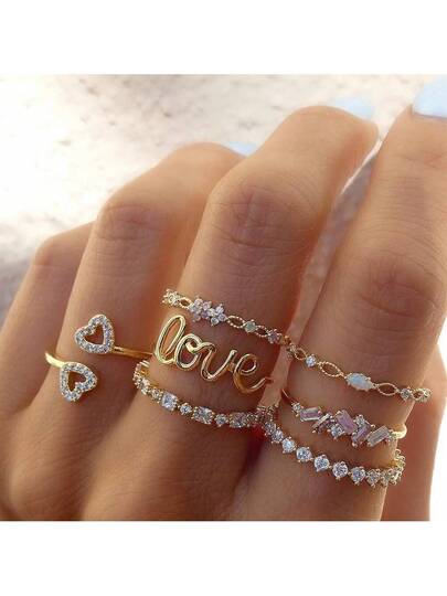 7pcs/Set Ladies' Fashionable Heart, Letter & Rhinestone Combination Ring Set Suitable For Party & Daily Wear - Gold - View 7