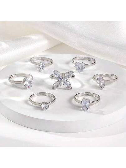 7pcs Set Luxury New Alloy Rings With Cubic Zirconia Stone Butterfly, Water Drop & Heart Designs, Adjustable Elegant Rings - Multicolor - View 1