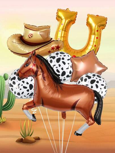 7pcs/Set Western Party Balloon, Including Brown Cowboy Hat Shape Balloon, Brown Horse Foil Balloon, Cow Print Balloon, Horseshoe Balloon, Suitable For Wild West Themed Birthday Party, Bachelor Or Bachelorette Party Decor And Farm Decor, Ideal For Western Birthday Party Decorations, Last Rodeo Bachelorette Party Decor, - Multicolor - View 7