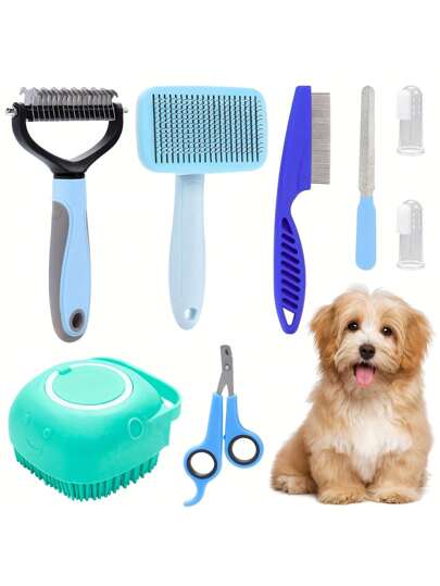 8 Pieces Dog Grooming Kit, Pet Self-Cleaning Set, With Pet Nail Clippers And File, Flea Comb, Pet Shampoo Brush, Pet Deshedding Brush, Pet Dematting Comb, Silicone Toothbrush - Blue - View 1