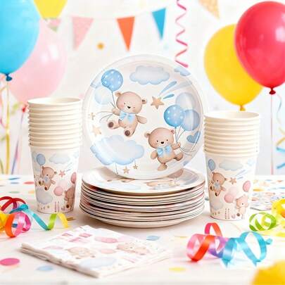 80pcs Cute Bear Gender Reveal Themed Disposable Tableware Set, Includes Disposable Plates, Napkins, And Paper Cups , Perfect For Valentine's Day, Camping, Patio Barbecues, Picnic, Wedding, Party And Birthday, Casual Gatherings ,Afternoon Tea , Suitable For Party Decorations, Birthday Decorations - Multicolor - View 1