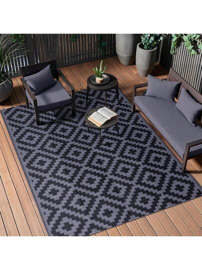 8ft X 10ft Outdoor Rug, Waterproof, Reversible Mat, Plastic Woven Area Rug, Outdoor Carpet, Geometric Pattern For Camper, Camping Site, Picnic, RV, Backyard, Patio, Balcony, Beach (Black & Gray) - Black and Gray - View 1