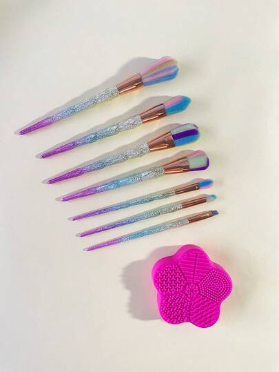 8pcs/Set Makeup Brush Cleaning Set Including Dry Cleaning Sponge Box, Silicone Cleaning Pad And 7 Frosted Multicolor Makeup Brushes - Multicolor - View 1