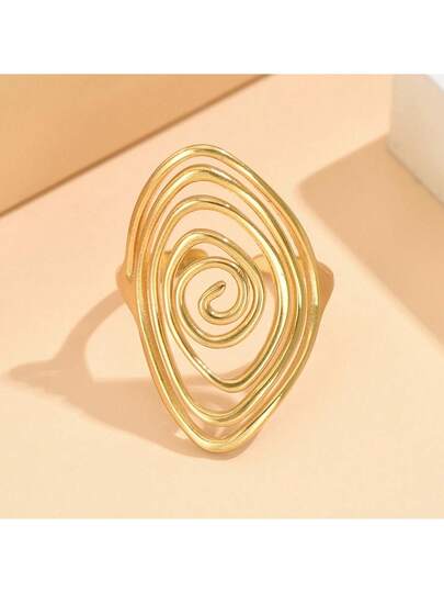 A Hollow Geometric Ring, Stainless Steel Ring, Hollow Large Ring, Threaded Ring, Oval Opening Ring, Retro Hollow Geometric Spiral Opening Ring, Creative Asymmetrical Adjustable Stainless Steel Cocktail Ring, Ladies Single Ring - Yellow Gold - View 1