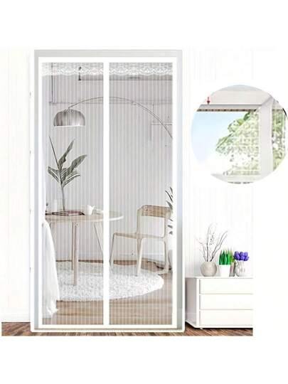 AIYYIPA 1pc White Striped Magnetic Sheer Curtain With Lace Embroidered Edges, Vertical Striped Design, Multi-Functional Insect Proof Room Divider For Living Room Bedroom Kitchen, Self-Adhesive And Washable Polyester Door Curtain - Multicolor - View 1