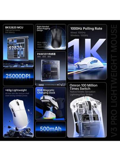 ATTACK SHARK 3-Mode Wireless Gaming Mouse, 25000 DPI, 62g Ultra-Light RGB Mouse, Supports Wired/2.4G/Bluetooth Connection, Broadcom BK52820 Chip, Omron Micro Switches, 100 Million Click Lifespan, 500mAh Battery & RGB Charging Base, Adjustable DPI, Suitable For PC Gamers - Multicolor - View 15