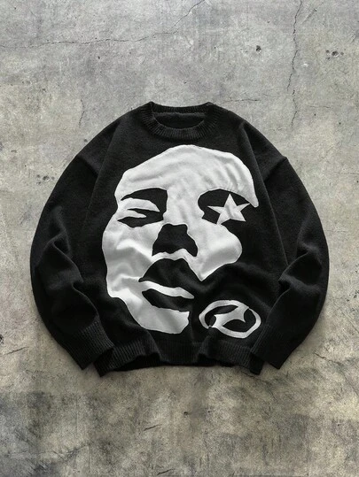 AXEPEAK Men's Casual Loose Fit Graphic Print Crew Neck Long Sleeve Sweater, Autumn/Winter - Black and White - View 1