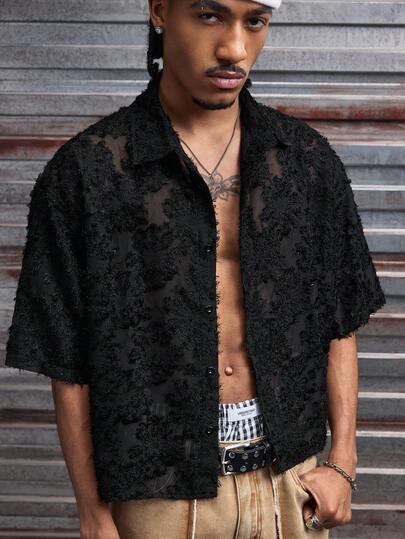 AXEPEAK Men's Cutout Short Sleeve Single-Breasted Loose Casual Shirt - Black - View 1