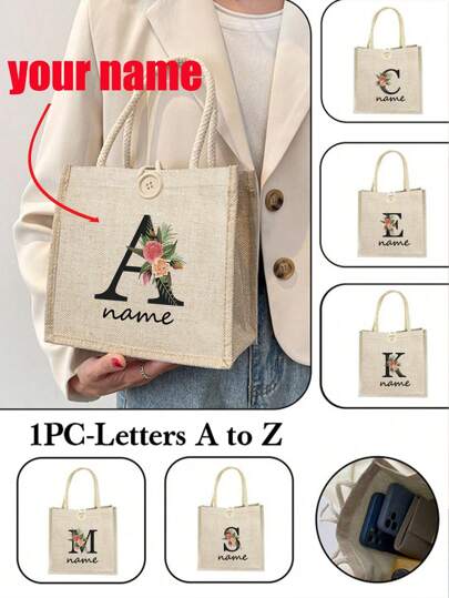 1pc Custom Linen Tote Bag, Personalized Custom Text Font And Color, Flower Letters Linen Bag, Your Own Design Women'S Custom Tote Bag, Unique Mother'S Day Gift, Lightweight, Fashionable, Personalized Tote Bag, Shoulder Bag, Casual Shopping Bag, Classic Gift Bag, Suitable For Daily, Commuter, Festival - Khaki - View 1