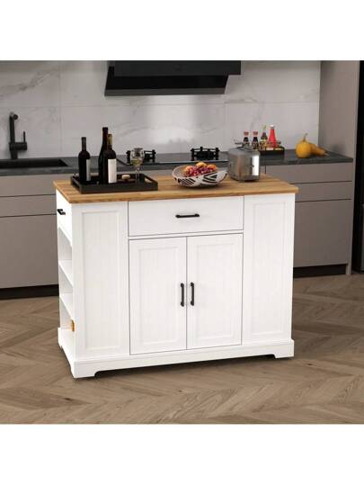 46'' Multi-Storage Rolling Kitchen Island With Rubber Wood Tabletop, Large Farmhouse Kitchen Cart With Adjustable Shelves And Drawers, Movable Dinning Table Bar With Storage Cabinet For Kitchen - 1 - View 7