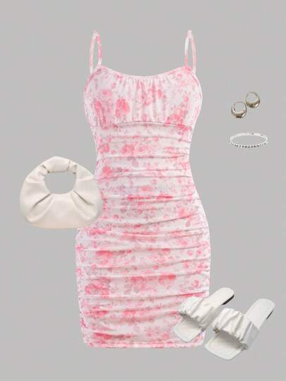 SHEIN Girlism Tween Girls Floral Print Mesh Double Layer Knitted Elastic Ruched Snug Fit Short Camisole Dress - Baby Pink - View 1