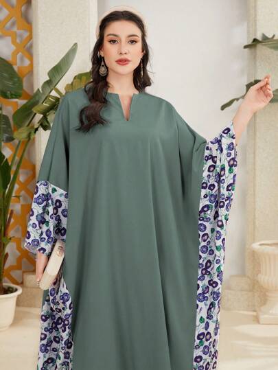 Al Najma Floral Print Spliced Sleeve Cuff Split Neck Kaftan - Green - View 1