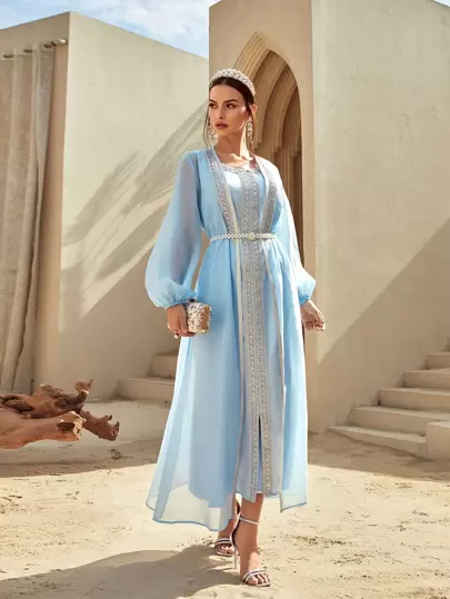 Al Najma Lace Trim Open Front Belted Coat & Slit Hem Dress Set 2 Piece Set - Baby Blue - View 1
