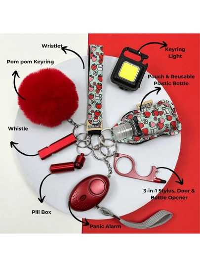 All Glam Multi Moo 9 Piece UK Legal Keychain Set With Panic Alarm, Torch, Whistle, Pom Pom, Wristlet, Pill Box, Sanitiser Pouch, And 3 In 1 Keychain Light - Strawberry Dream - View 4