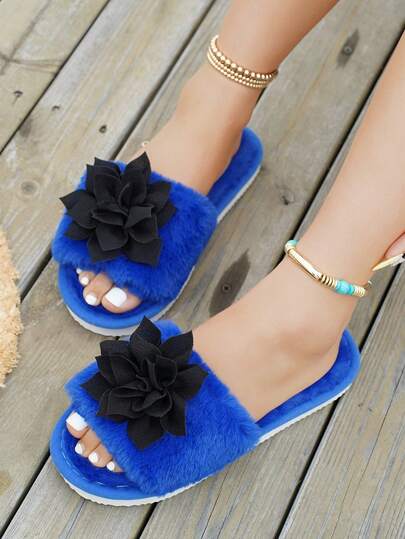 All Season Plush Slippers, Indoor Home Warm Fluffy Slide Slippers With Bow Decor, Thermal Slippers For Spring, Summer, Autumn & Winter - Black - View 1