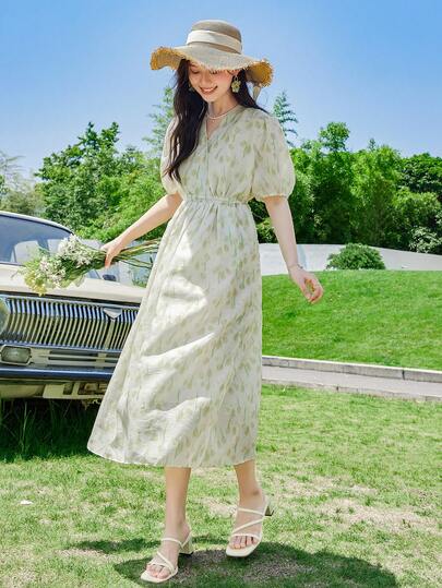 Allover Floral Print Puff Sleeve Tie Back Dress - Multicolor - View 1