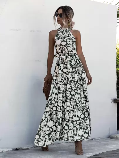 Breezaya Allover Floral Print Ruffle Hem Belted Halter Dress - Multicolor - View 1