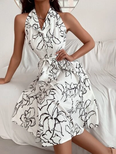 Aveloria Allover Print Belted Shirt Dress - Black and White - View 1
