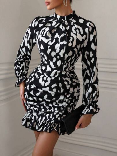 SHEIN Clasi Allover Print Flare Sleeve Ruffle Hem Bodycon Dress - Black - View 1