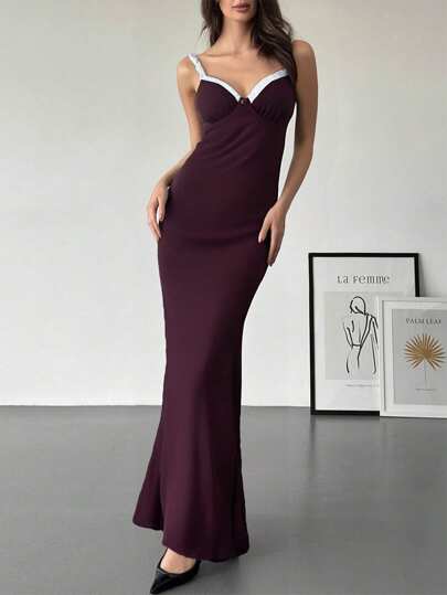 Aloruh Elegant Contrast Color Sleeveless Fishtail Dress - Burgundy - View 1