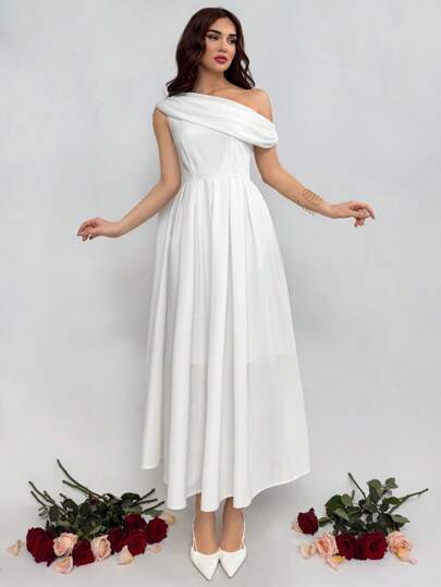 Aloruh Valentine's Day White Asymmetric Neck Sleeveless Cinched Waist Pleated Mid-Calf Dress For Women - White - View 1