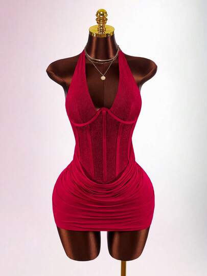 Amplova Elegant Sexy Solid Color Lace Patchwork Backless Halter Mini Dress Summer Dresses For Women Valentine Dress Elegant Dresses For Party Summer Holiday Outfits Casual Outfits For Women - Red - View 1