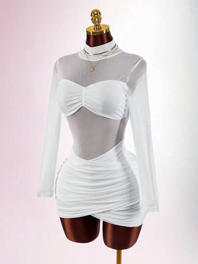 Amplova Women's Autumn Fashion Long Sleeve Ruched Bodycon Mini Dress - White - View 1