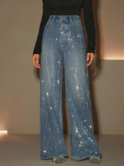 Anewsta Heavily Embellished Rhinestone Studded Wide Leg Jeans, Suitable For Autumn, Formal Occasions, Parties, Chic, New Year, Christmas, Work, Graduation - Blue - View 1