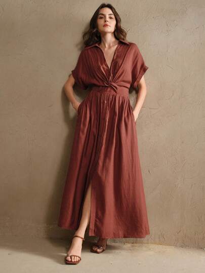 Anewsta Women's Design Sense V-Neck Single-Breasted Twist Waist Long Dress, Suitable For Festival, Going Out, Vacation Outfits - Burgundy - View 1