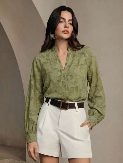 Anewsta Women's Elegant High-End Jacquard Fabric Blouse, Spring - Olive Green - View 1