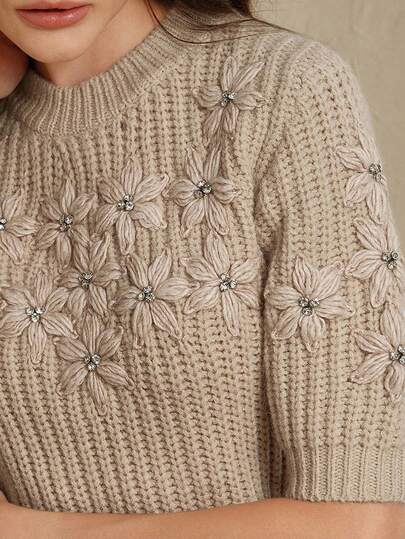 Anewsta Women's Knitted Top, Handmade Fashion 3D Crochet Design Slim Fit Short Sweater - Light Grey - View 1